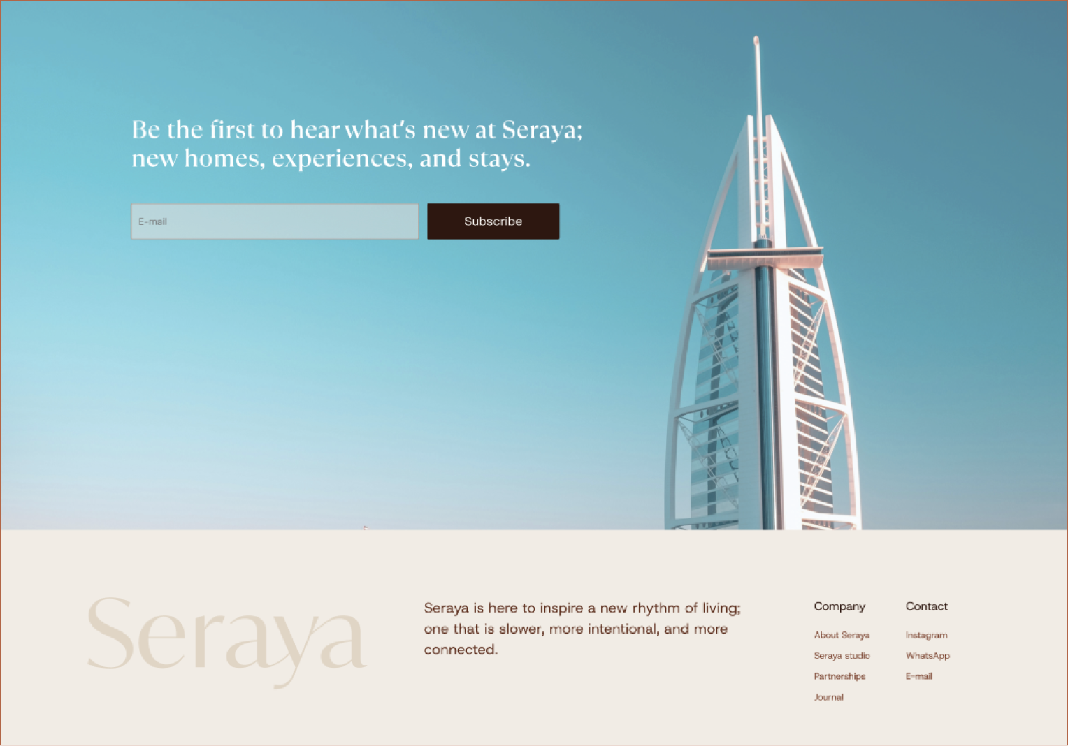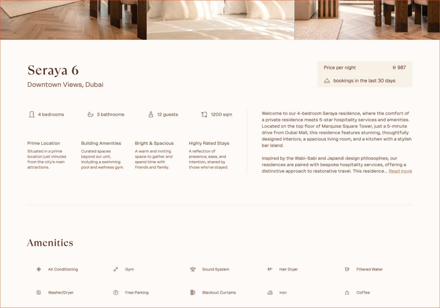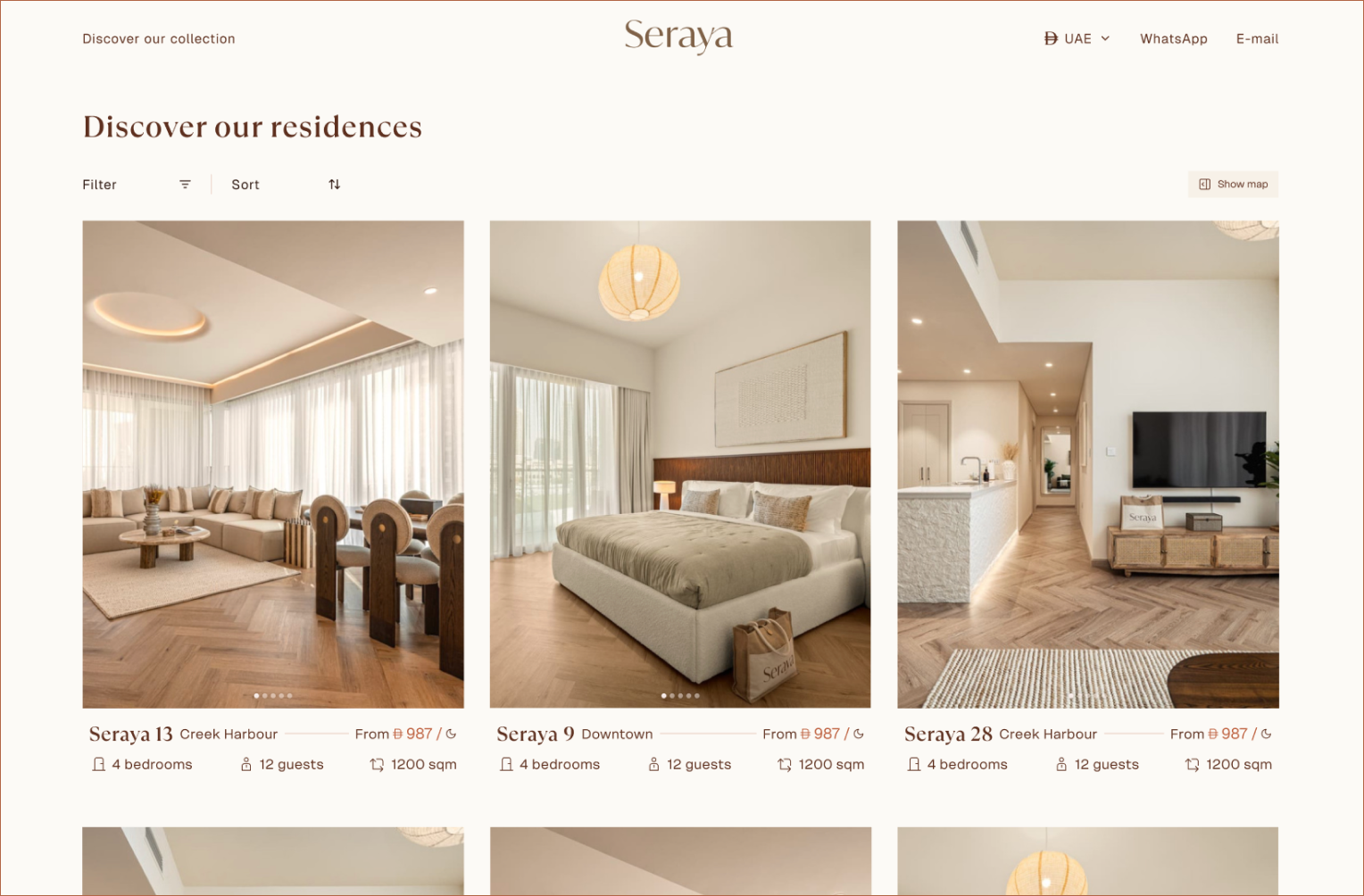Seraya is a Dubai-based property management brand offering a refined collection of high-end apartments for both short and long-term stays. The challenge was to build a digital home that mirrored the sophistication of the physical properties, balancing high-end aesthetics with a seamless, high-conversion booking engine.