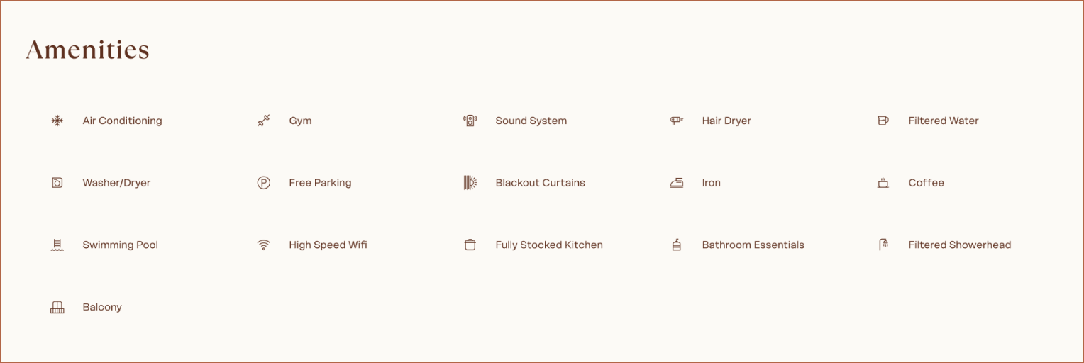 Instead of off-the-shelf sets, I designed a custom suite of thin-stroke icons representing high-end amenities like "private chef access," "shower-head filter," and "valet services."